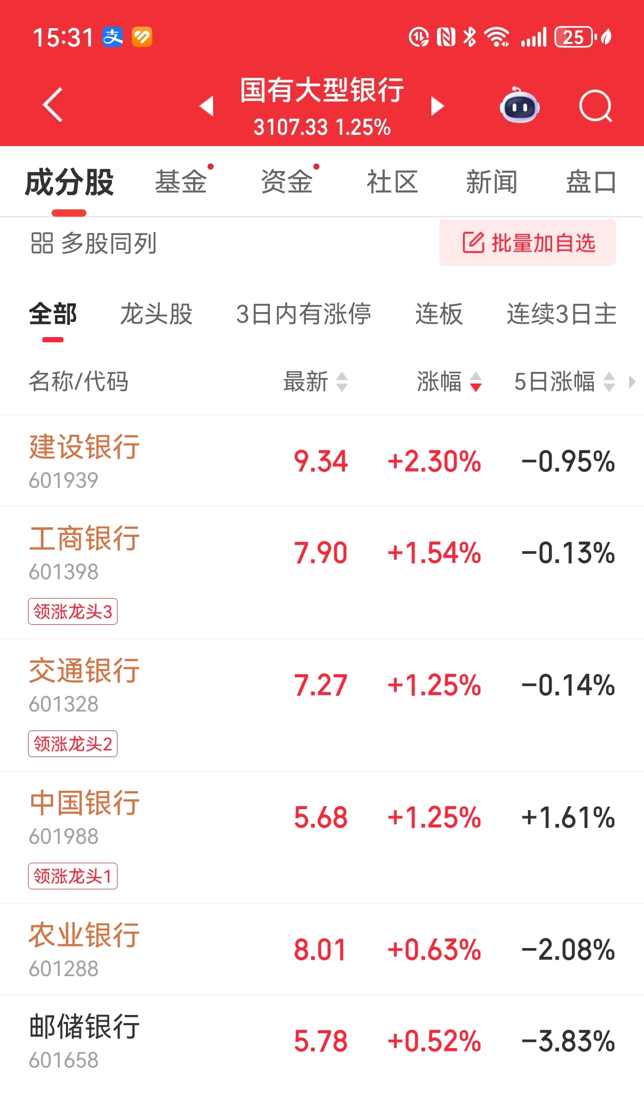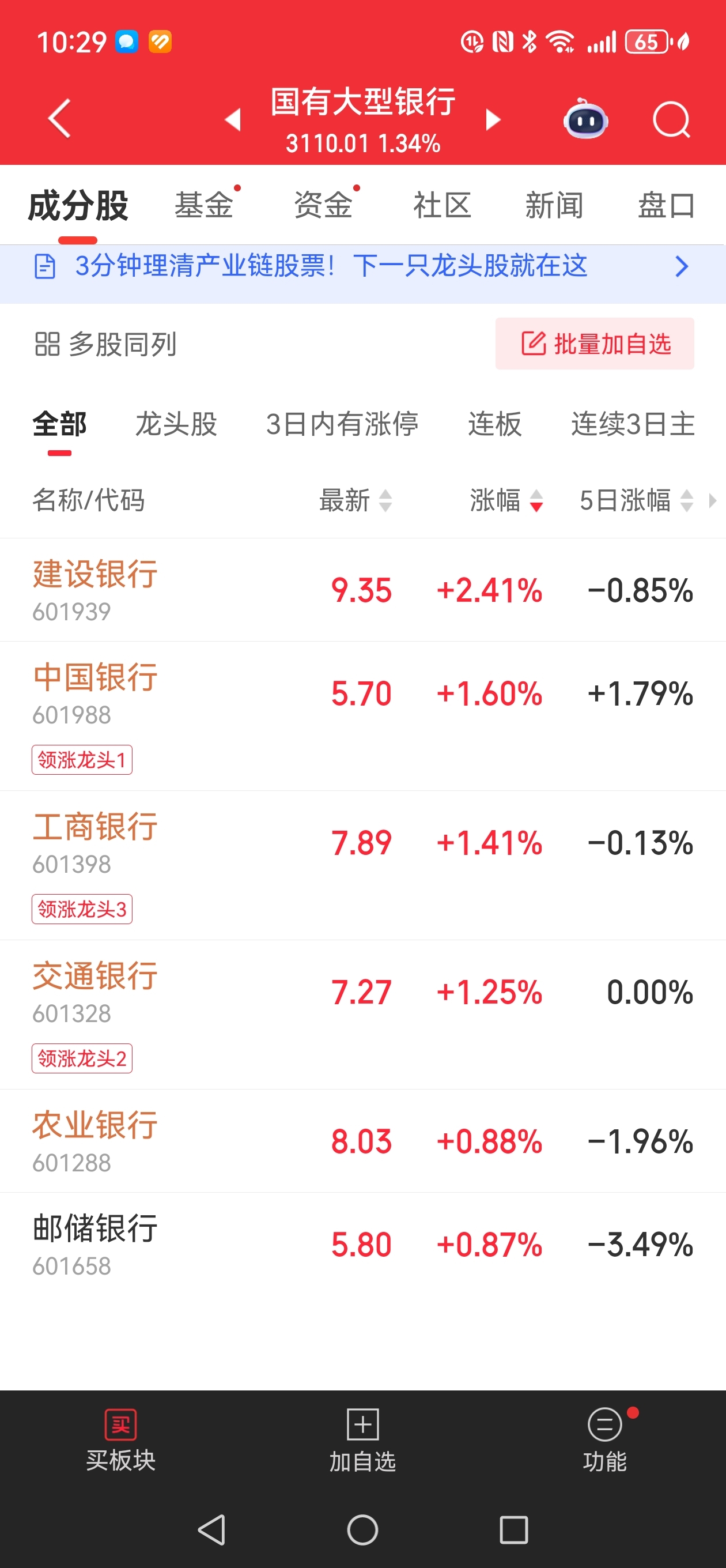 $建设银行(SH601939)$ 今天开盘半个小时建设银行王者归来!重新举起六大银行的领涨大旗。
