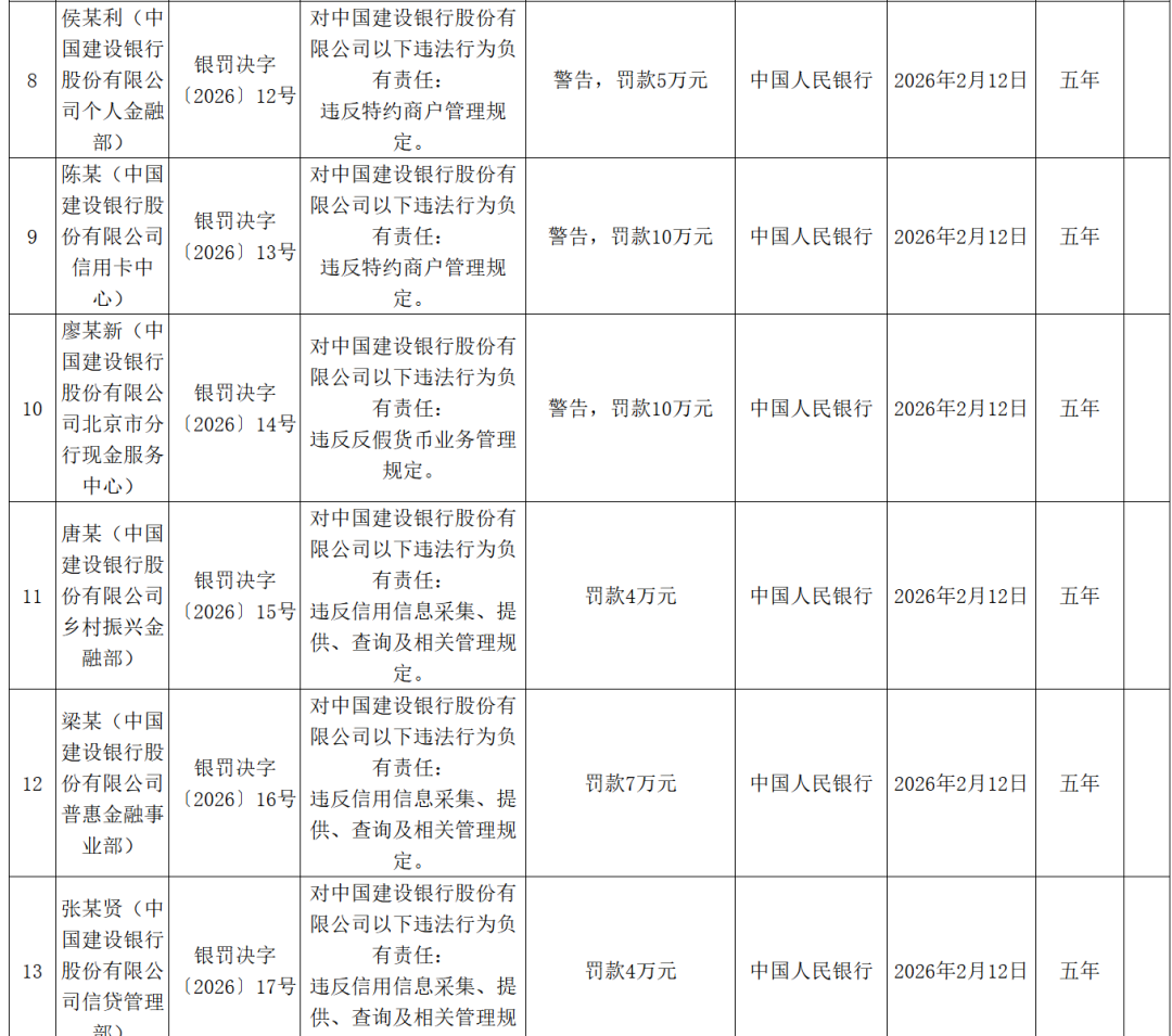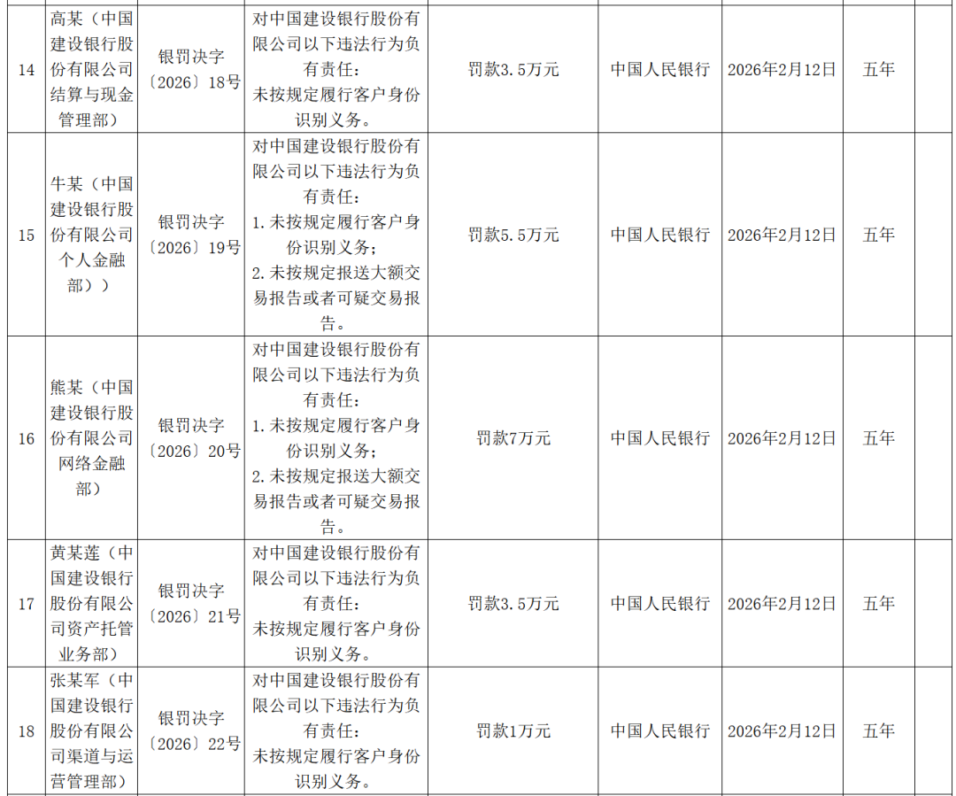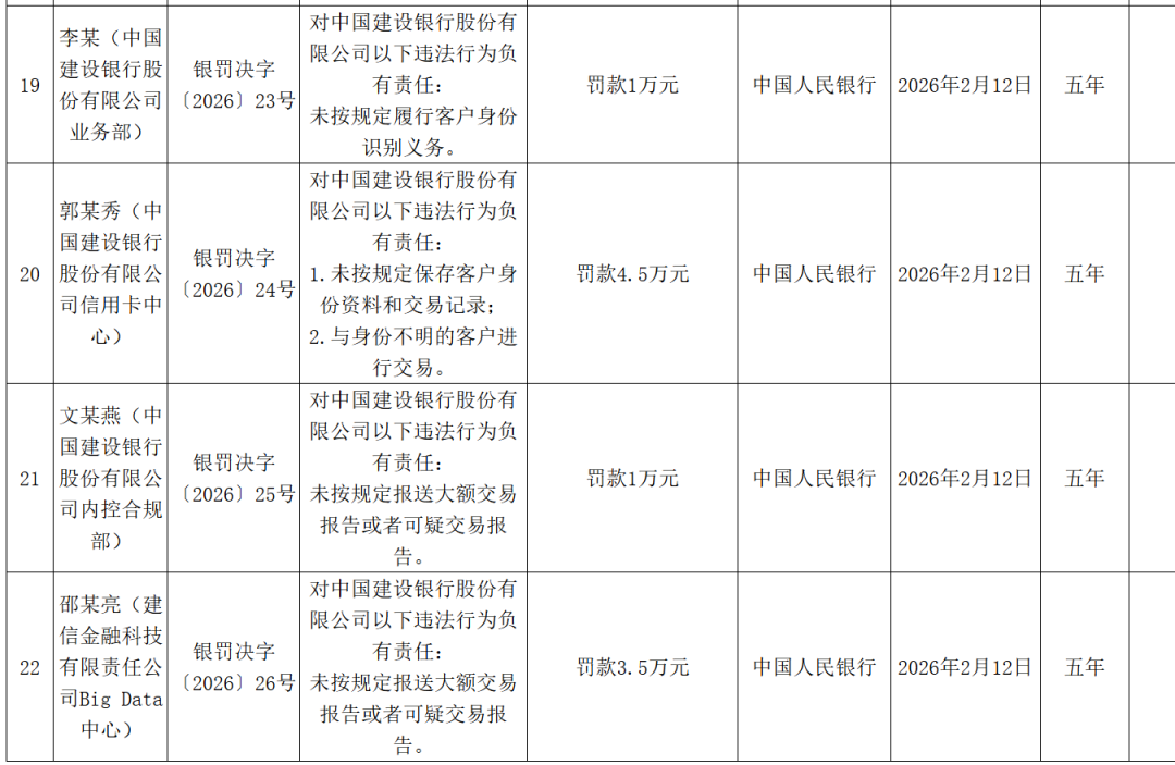 此外,21人因对建行违法行为负有责任,收到央行罚单。