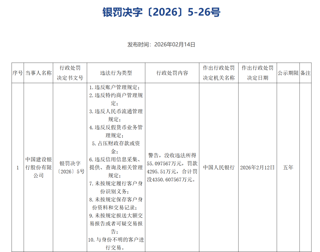 2月14日,据央行官网公布的行政处罚公示显示,因10项违法行为,建设银行被央行警告,没收违法所得55.097567万元,罚款4295.51万元,合计罚没4350.607567万元。