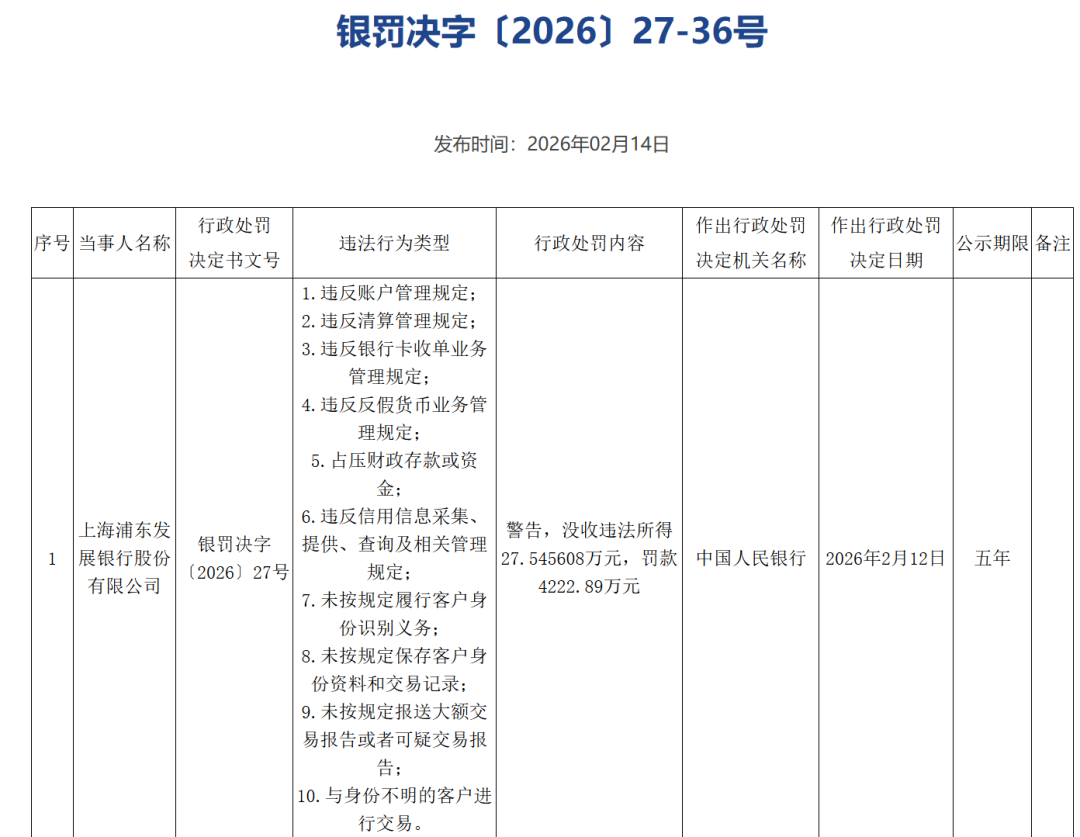 行政处罚公示显示,上海浦东发展银行存在十项违法行为类型,受到警告,被央行没收违法所得27.545608万元,罚款4222.89万元。