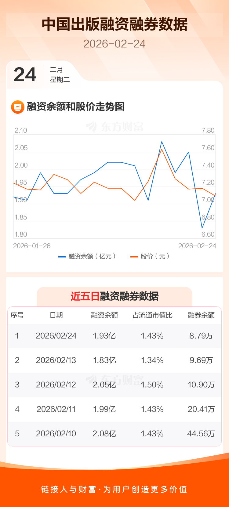 交易所最新数据显示,中国出版于2026年2月24日获融资买入2527.49万元,融资偿还1579.81万元,当日融资净买入947.68万元。目前,该股融资余额1.93亿,占流通市值比例为1.43%。