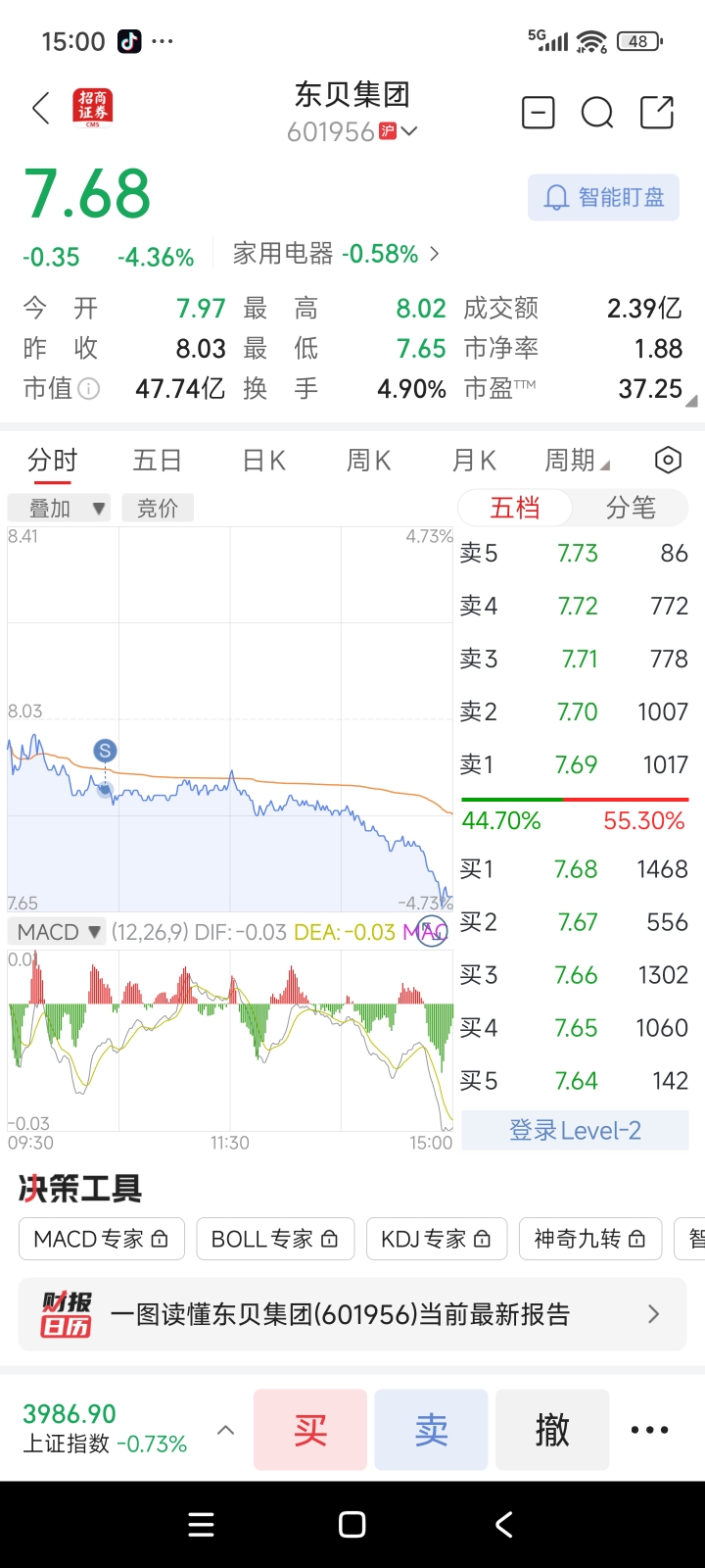 $东贝集团(SH601956)$ 7.76进的。。昨天没出。。今天只赚一个点。。还好跑了!!!!!估计1.9亿研发失败!!