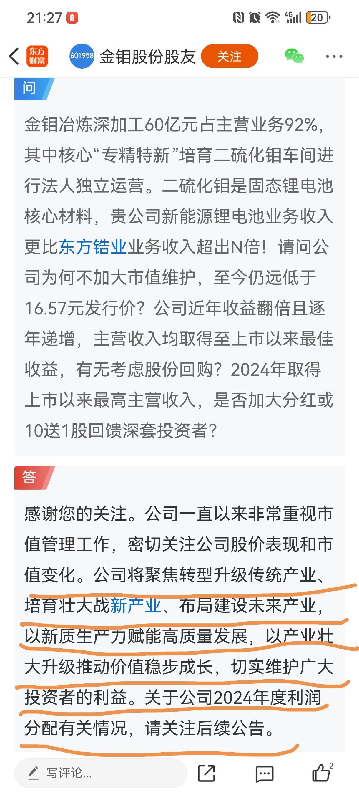 $金钼股份(SH601958)$ 拿着又不涨,弃之又不甘。反复看了下董秘的回复…就这还有点东西…有懂的吗?