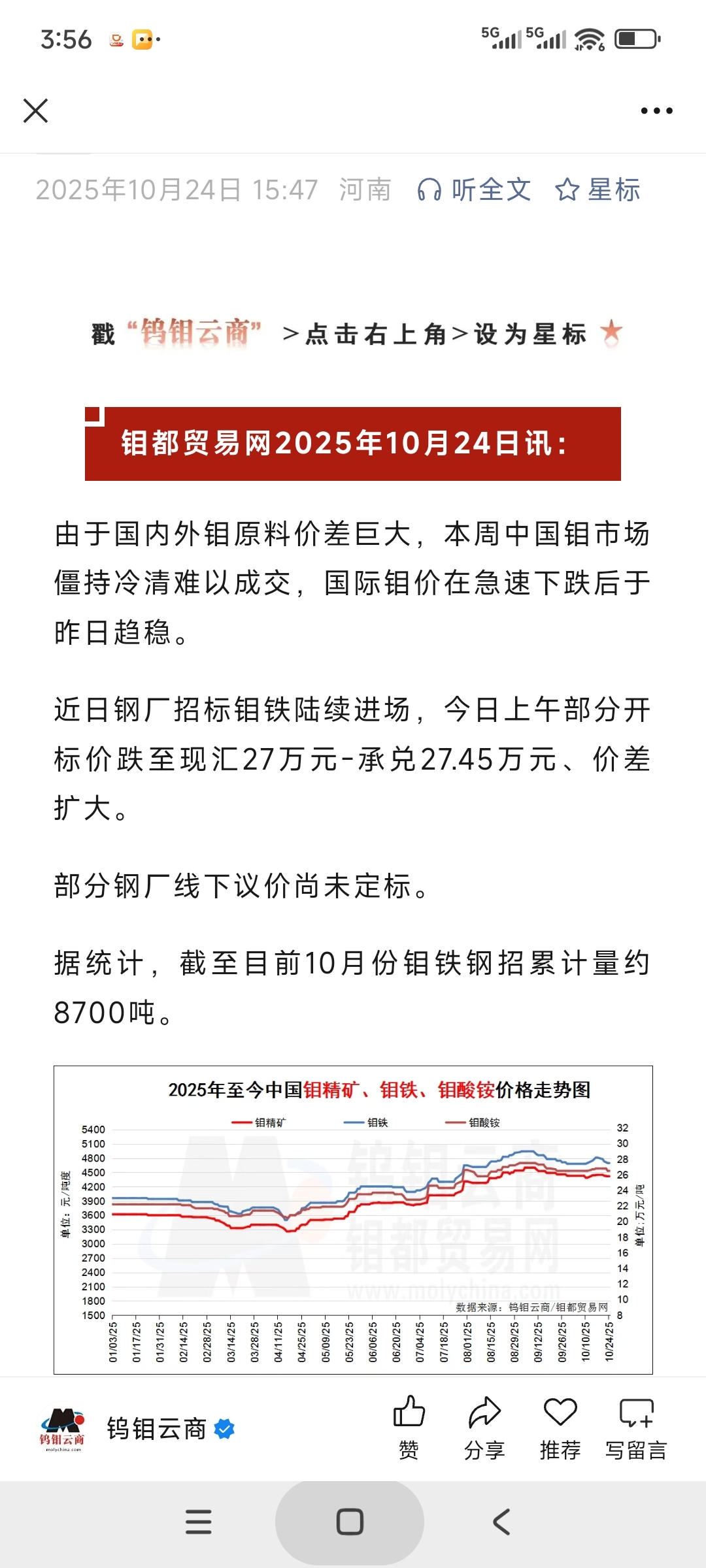 $金钼股份(SH601958)$ 钼铁已经跌到27万了,还在下跌,而且是急跌