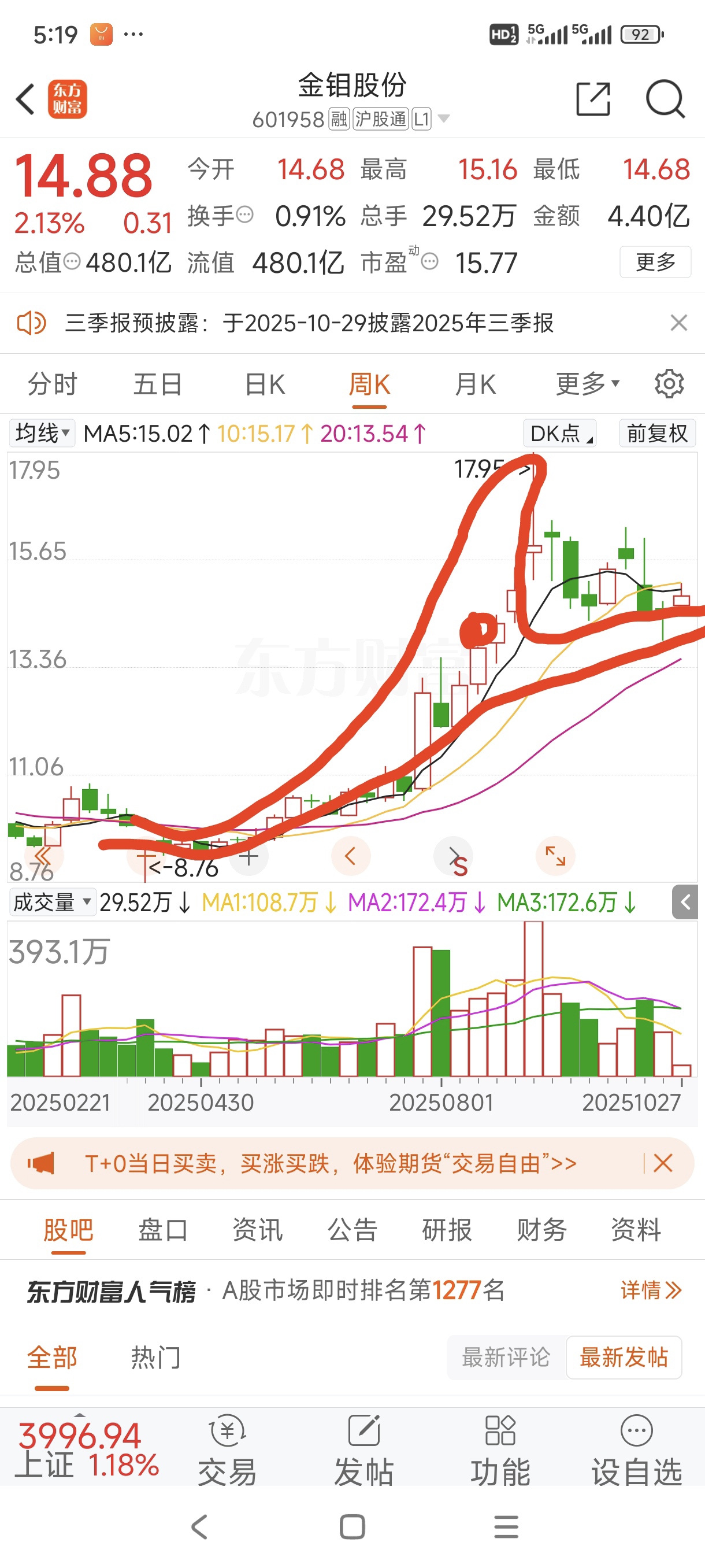 钼价暴跌金钼不跌,强成锤子了!15元上下反复磨人,周线超级老鸭头已形成,近几周的
