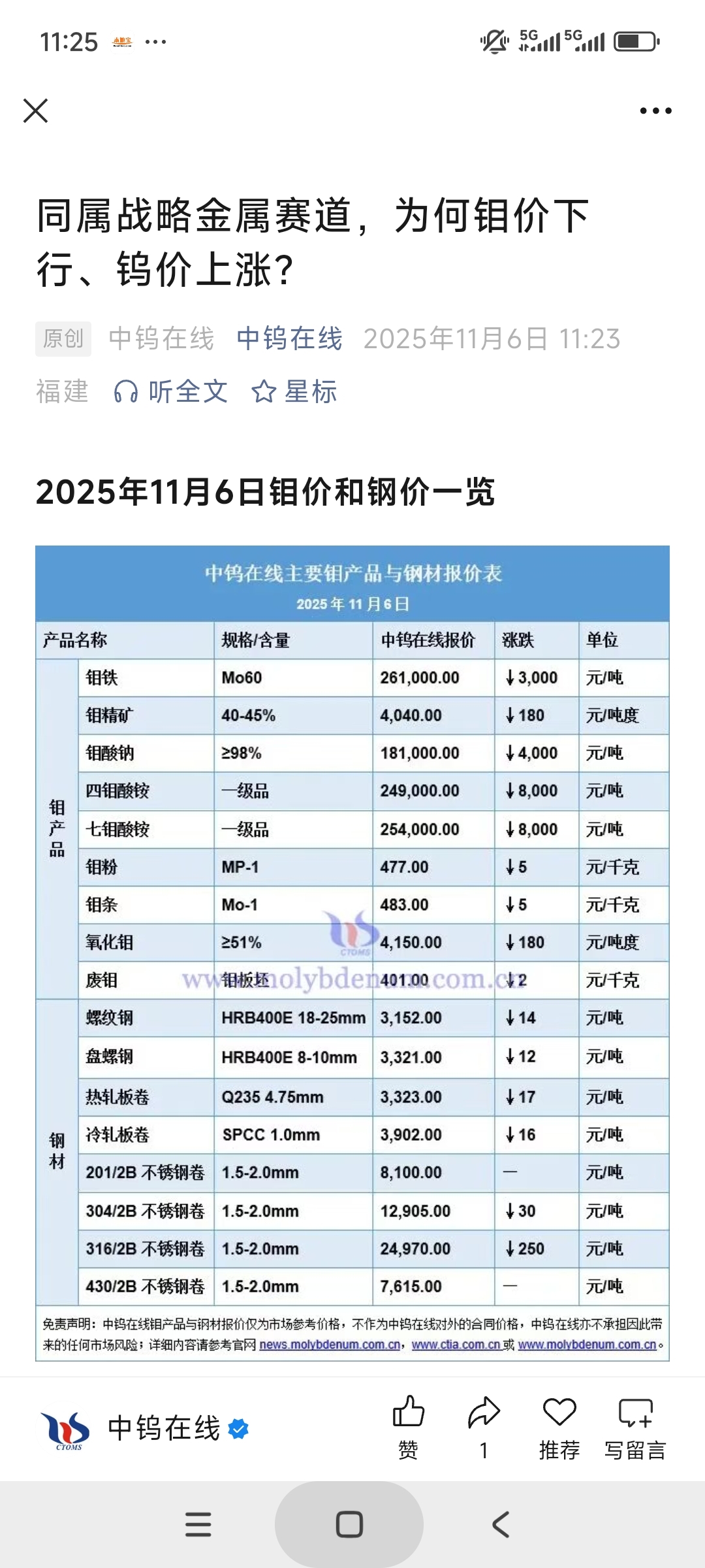$金钼股份(SH601958)$ 钼价继续大暴跌