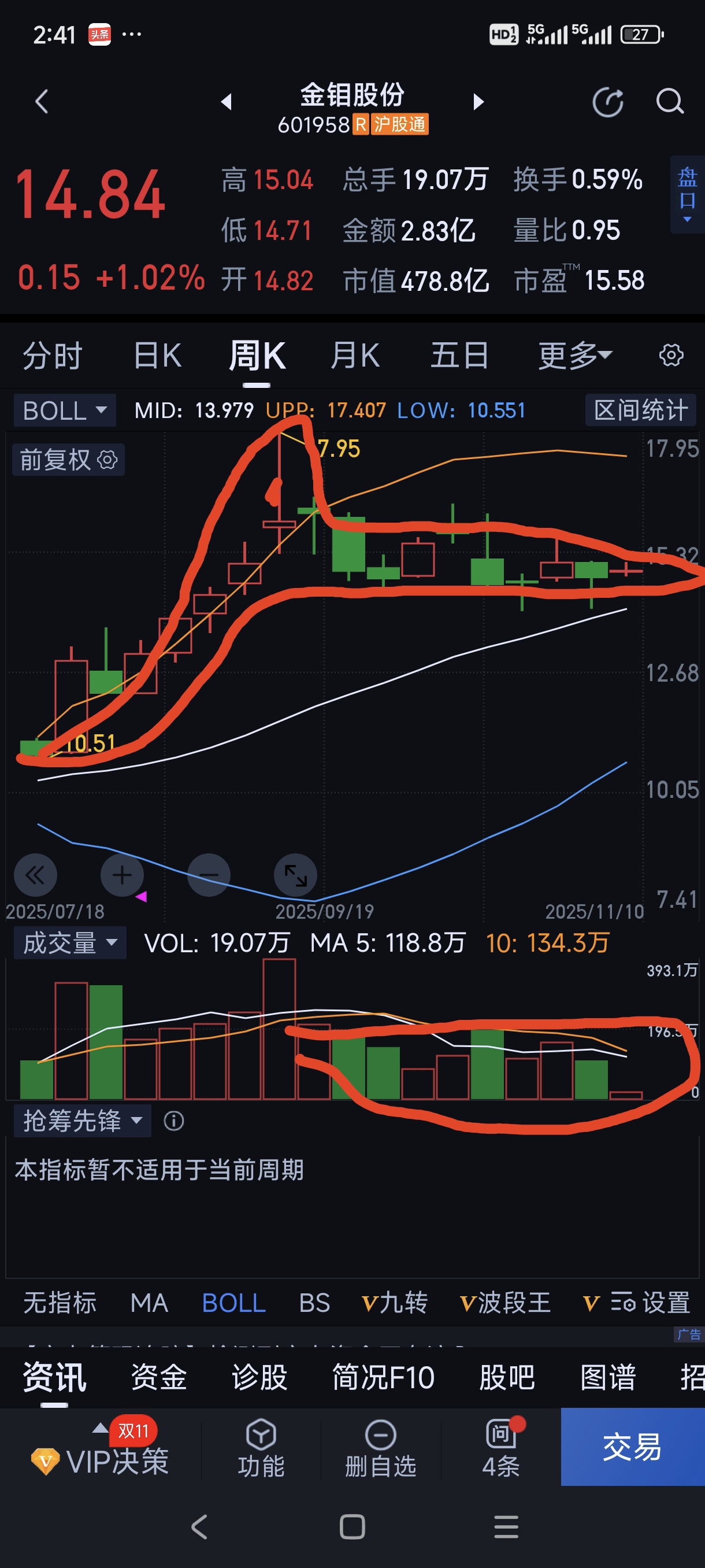 放量上涨缩量横盘,把中金事故和紫金合作那两波涨停进场热钱驱赶出去,鸭嘴越长散户持仓成本越接近15元,等美元开始下跌钼价上涨或极缩量时,开始向上突破