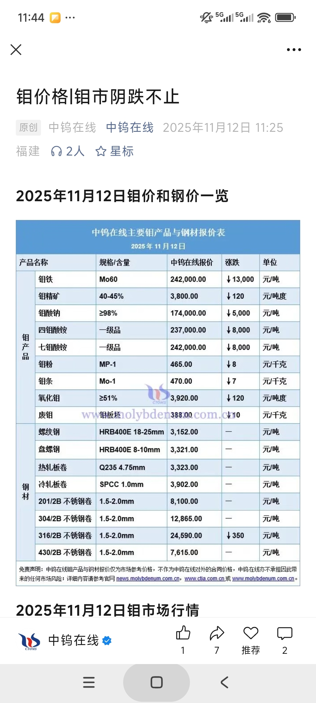 $金钼股份(SH601958)$ 钼价继续大暴跌