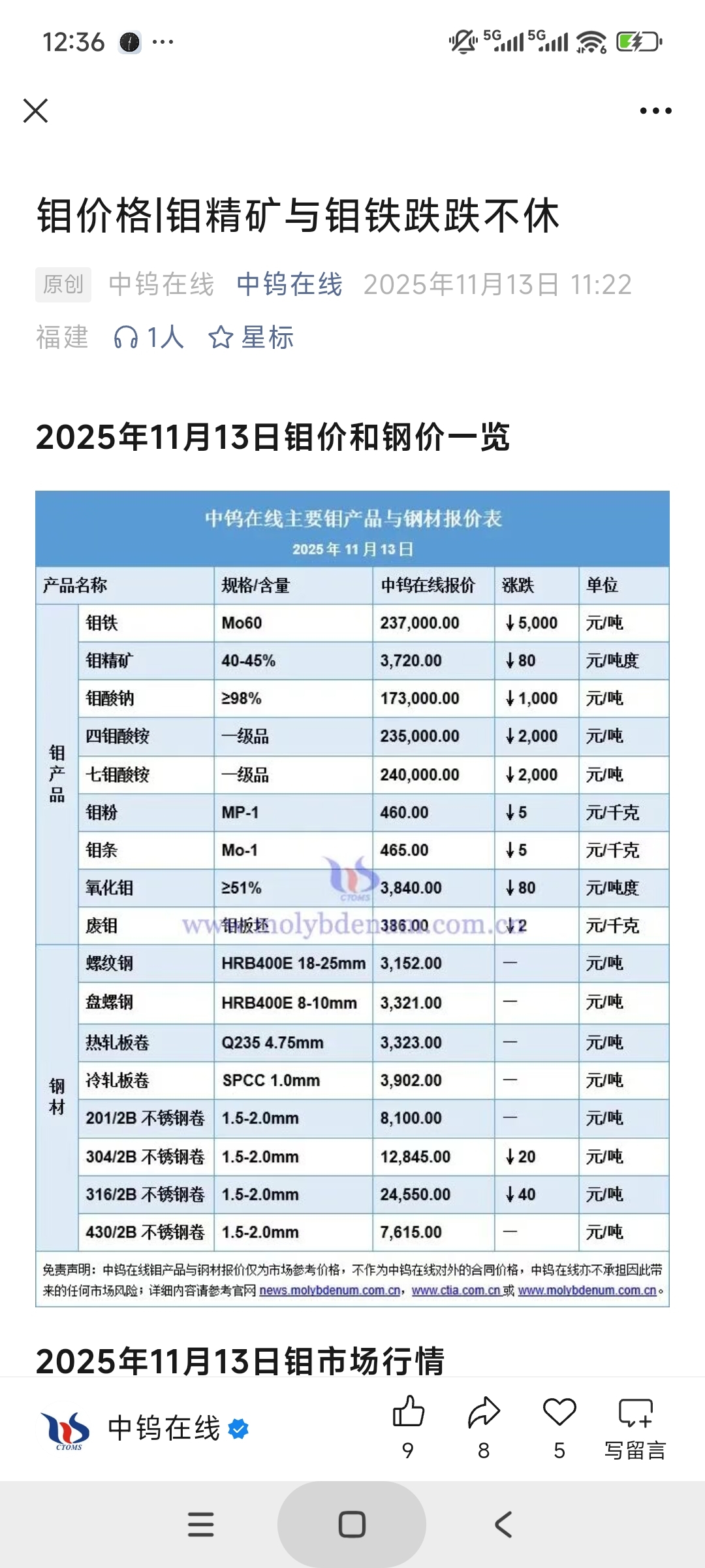 $金钼股份(SH601958)$ 钼价继续大暴跌
