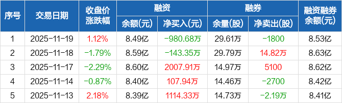 金钼股份:融资净偿还980.68万元,融资余额8.49亿元(11-19)