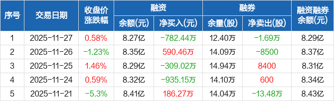 金钼股份:融资净偿还782.44万元,融资余额8.27亿元(11-27)