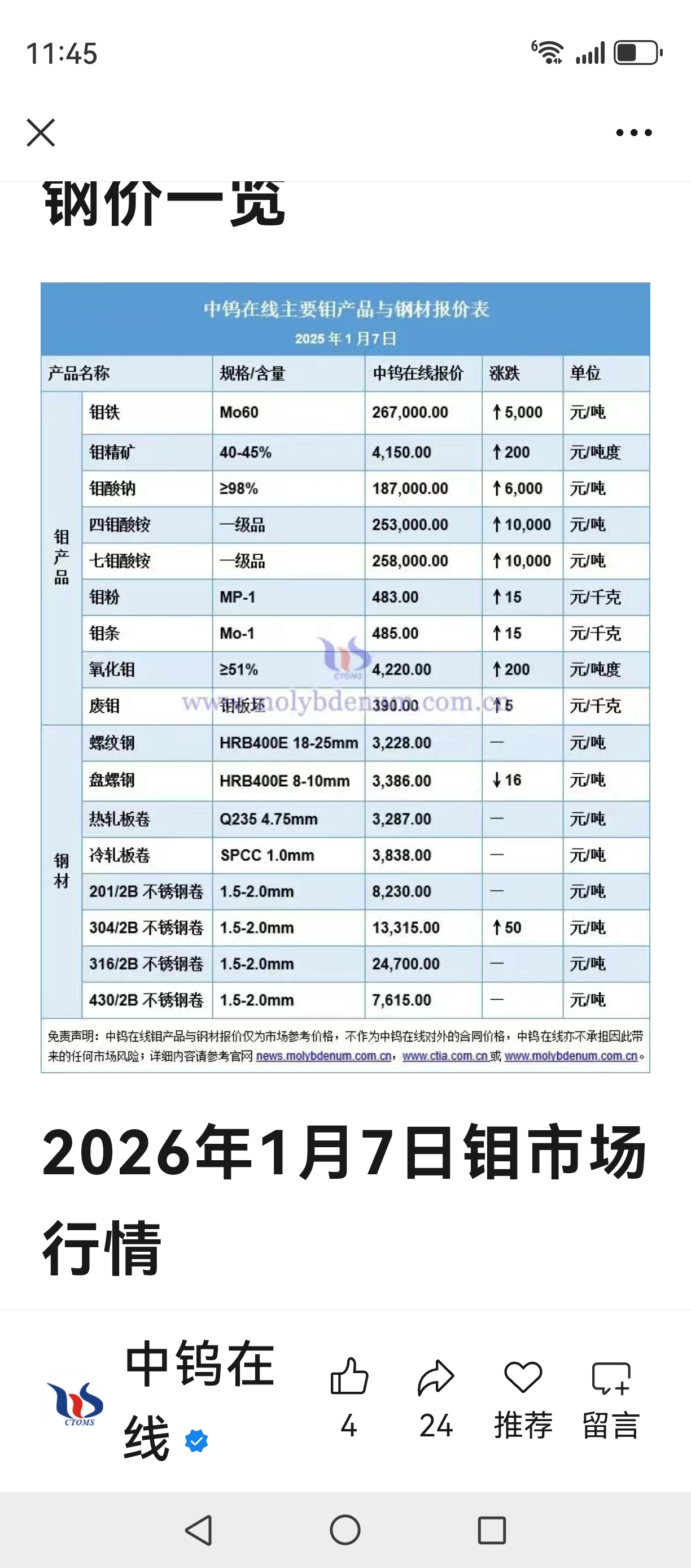 钼价涨疯了。