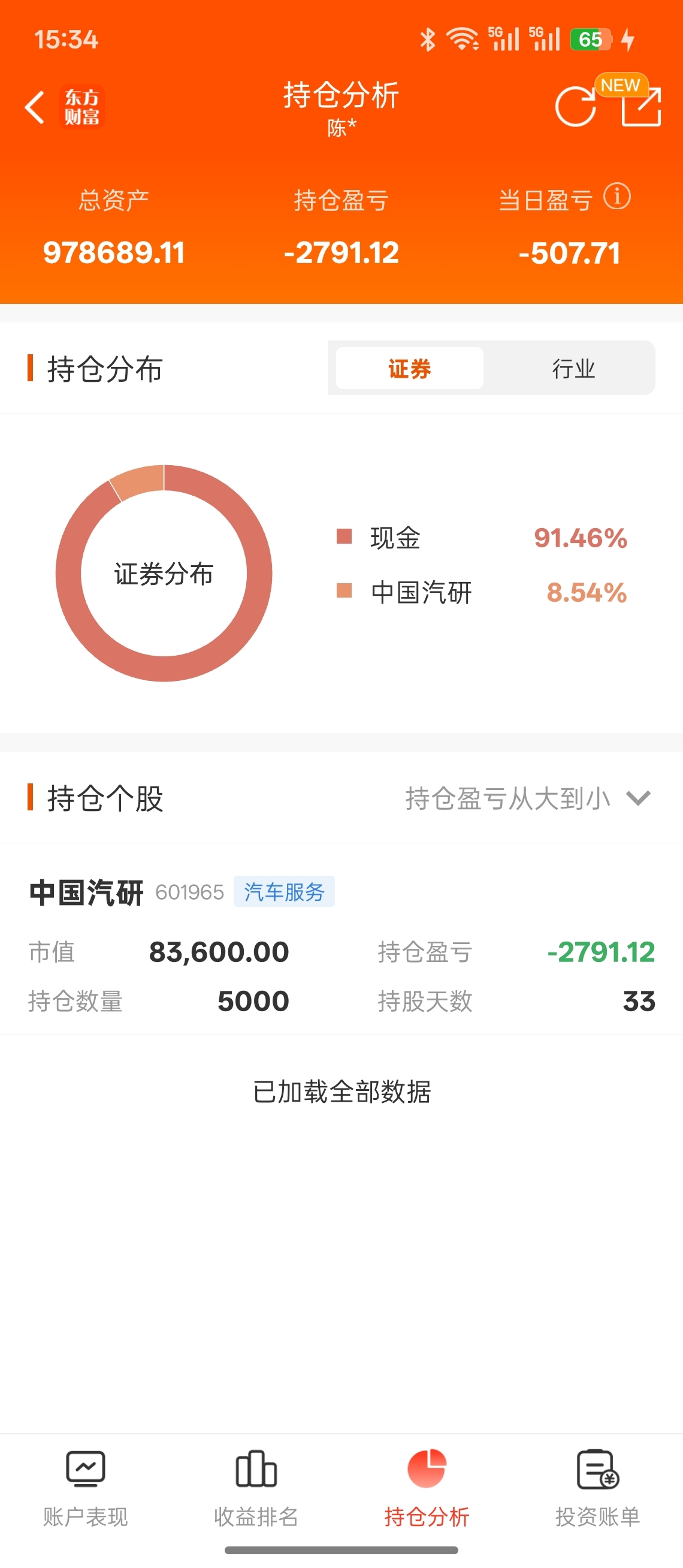 $中国汽研(SH601965)$ 拿了33天了,亏了3%
