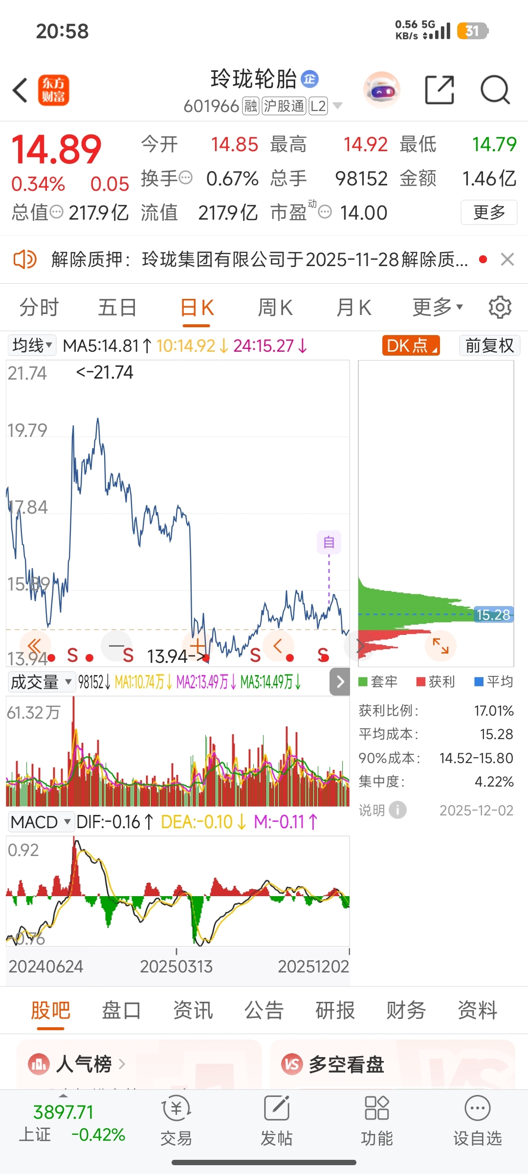 $玲珑轮胎(SH601966)$ 其他的不知道,何时大涨也不知道!但是我知道,现在的价格只要一个涨停就解放了所有的套牢盘!