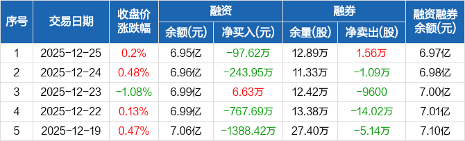 玲珑轮胎:融资净偿还97.62万元,融资余额6.95亿元(12-25)