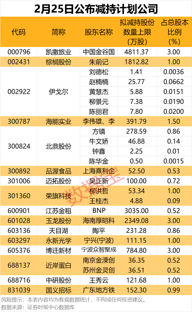 2月25日共有16家公司披露股东减持计划,拟减持股份比例较高的有凯撒旅业、玉龙股份、博迁新材等。