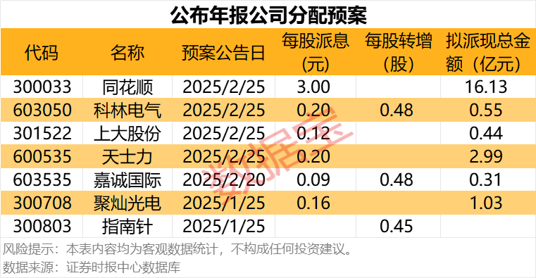 截至2月25日,7家公司年报亮相,均在年报中披露了年度分配预案,其中分配方案中包含转增的公司有3家,科林电气10送转4.8股,嘉诚国际10送转4.8股,指南针10送转4.5股。