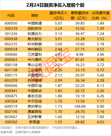 具体到个股,2月24日40只股融资净买入额超亿元。中国联通融资净买入额居首,当日净买入5.07亿元;其次是润和软件、软通动力,融资净买入金额分别为3.24亿元、3.12亿元;融资净买入金额居前的还有紫光股份、科华数据、神州数码等。