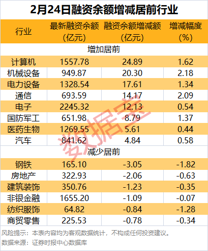 分行业统计,申万所属一级行业有20个行业融资余额增加,计算机行业融资余额增加最多,较上一日增加24.89亿元;融资余额增加居前的行业还有机械设备、电力设备、通信等,融资余额分别增加20.30亿元、17.61亿元、14.17亿元;融资余额减少的行业有11个,钢铁、房地产、建筑装饰等行业融资余额减少较多,分别减少3.05亿元、2.06亿元、1.23亿元。