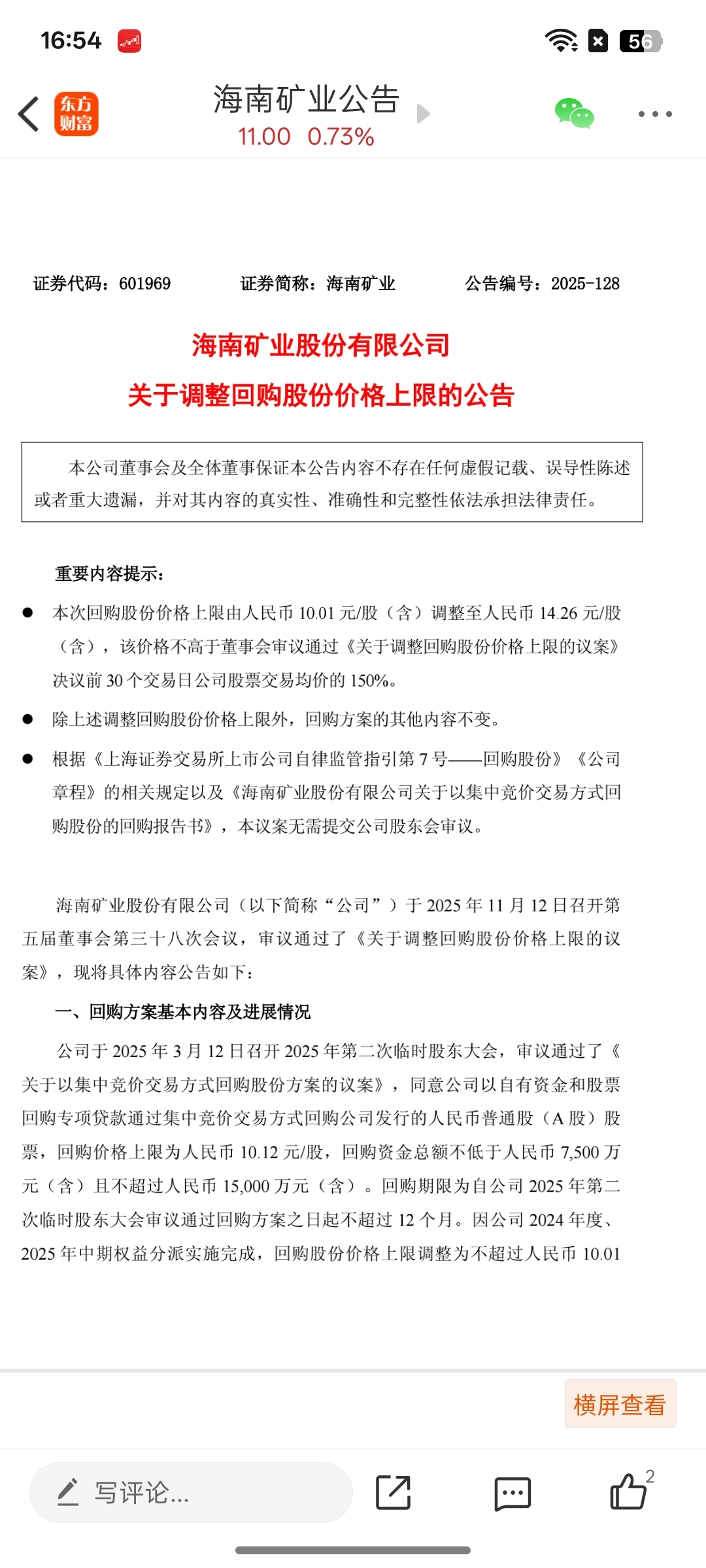 $海南矿业(SH601969)$ 回购上限的价格由10.01上调到14.26了。明天一字板了。