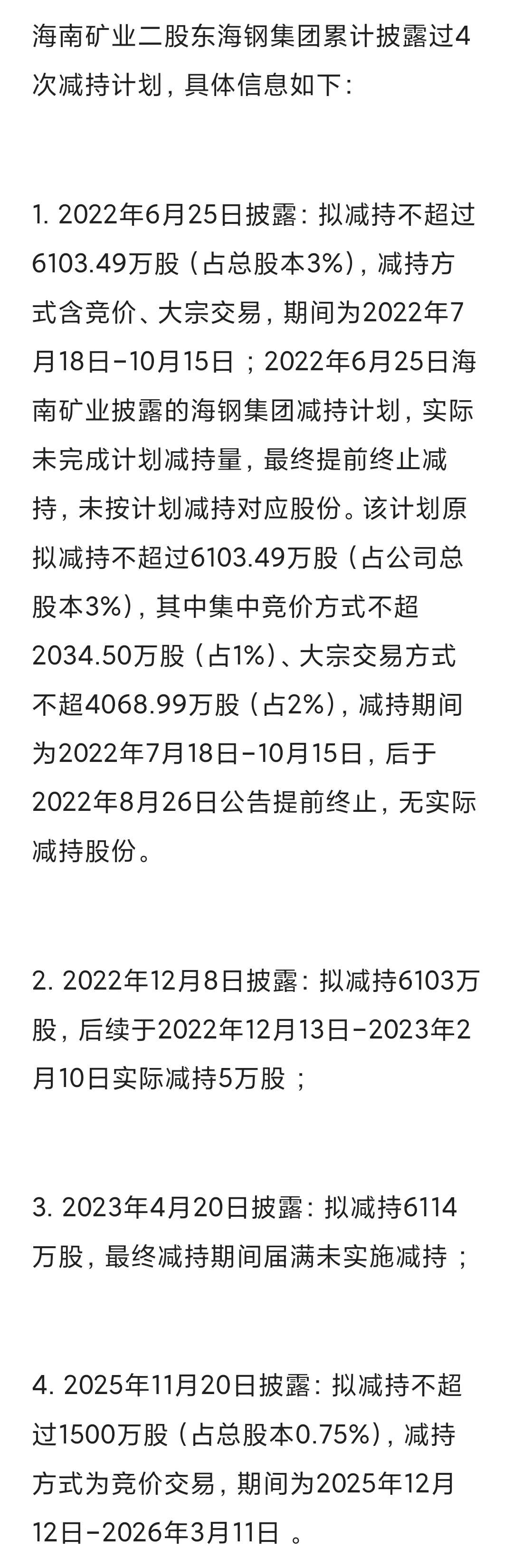 $海南矿业(SH601969)$ 周末闲得无聊,聊聊海钢的减持。当看到公告时个人认为中性偏利多,个中原因以前已详述。现在想来想去总觉得海钢此番减持公告会否有不可告人之目的?会否又是一次“忽悠”式减持??