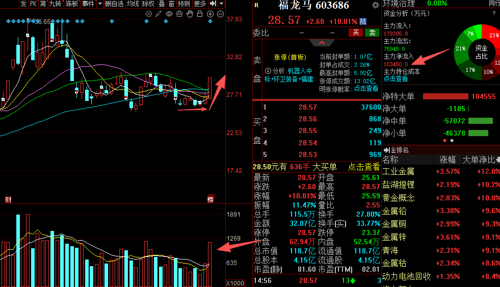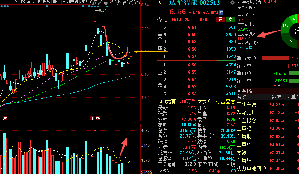近期表现确实亮眼,同时踩着海上福建和商业航天两个热门方向,紫金关注度一直在线。周三止跌企稳后,股价明显开始转强,整体呈现向上修复的节奏。到了周五更是直接加速,早盘阶段就迅速冲板,虽然因为抛压较大没能封住,出现了炸板,但股价依然维持在高位震荡,没有出现明显跳水,说明下方承接力相当不错。当天量价配合健康,换手充分,筹码在高位完成了有效交换。从技术面来看,股价已经重新站回多条均线上方,加速修复的趋势十分明显。今日这票小高开概率大,即便平开或小幅低开,先回踩一下20均线做个短暂吸筹,之后只要能顺利向上突破6.72这个日内高点,就有望继续走加速。