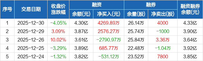 海南矿业:融资净买入4269.89万元,融资余额4.3亿元(12-30)