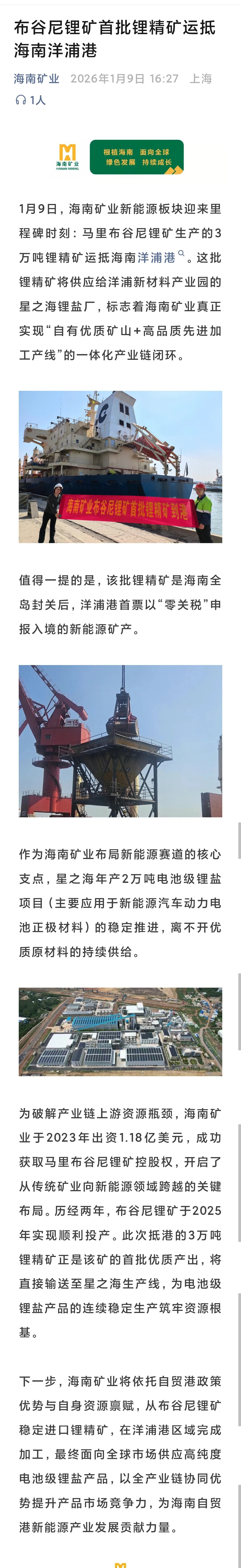 布谷尼锂矿首批锂精矿运抵海南洋浦港