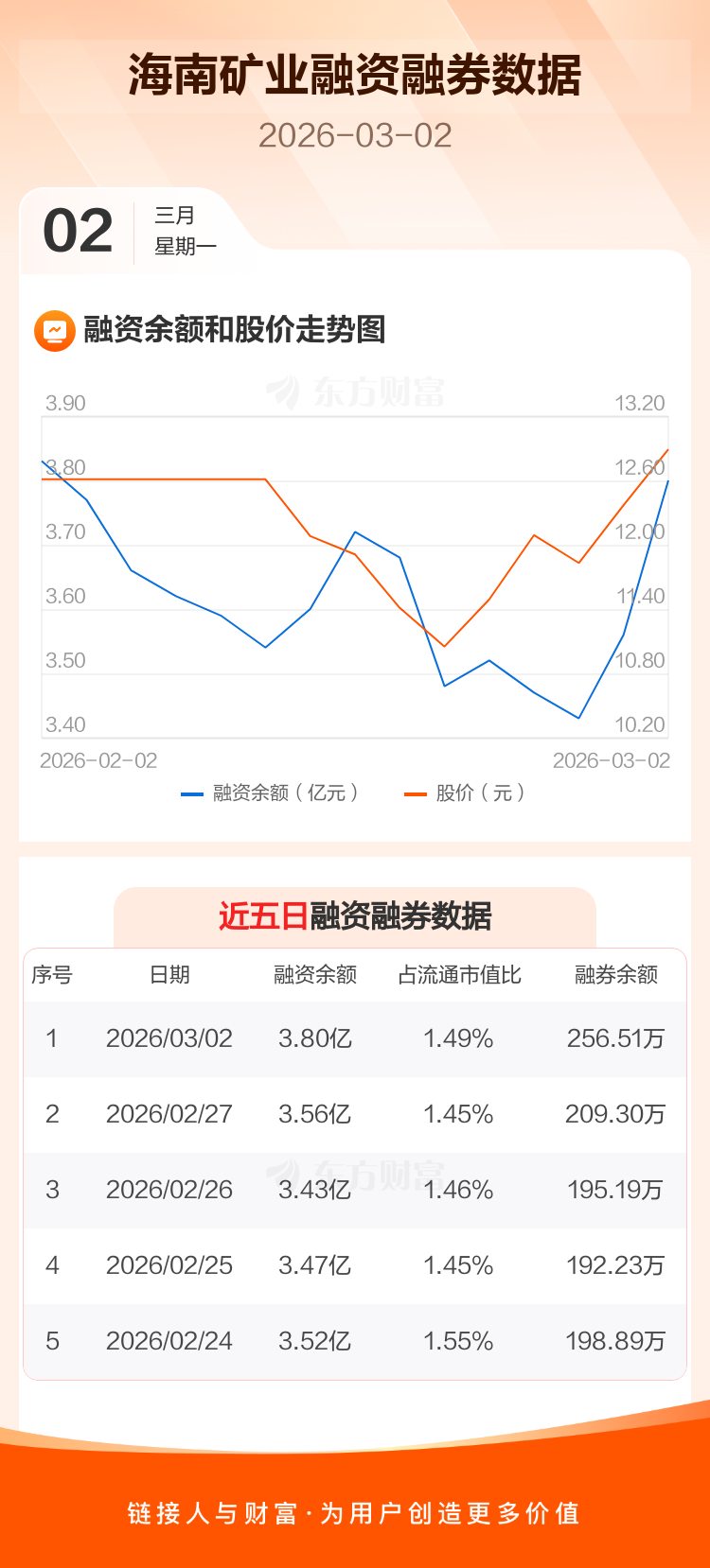 交易所最新数据显示,海南矿业于2026年3月2日获融资买入1.16亿元,融资偿还9146.36万元,当日融资净买入2436.93万元。目前,该股融资余额3.80亿,占流通市值比例为1.49%。