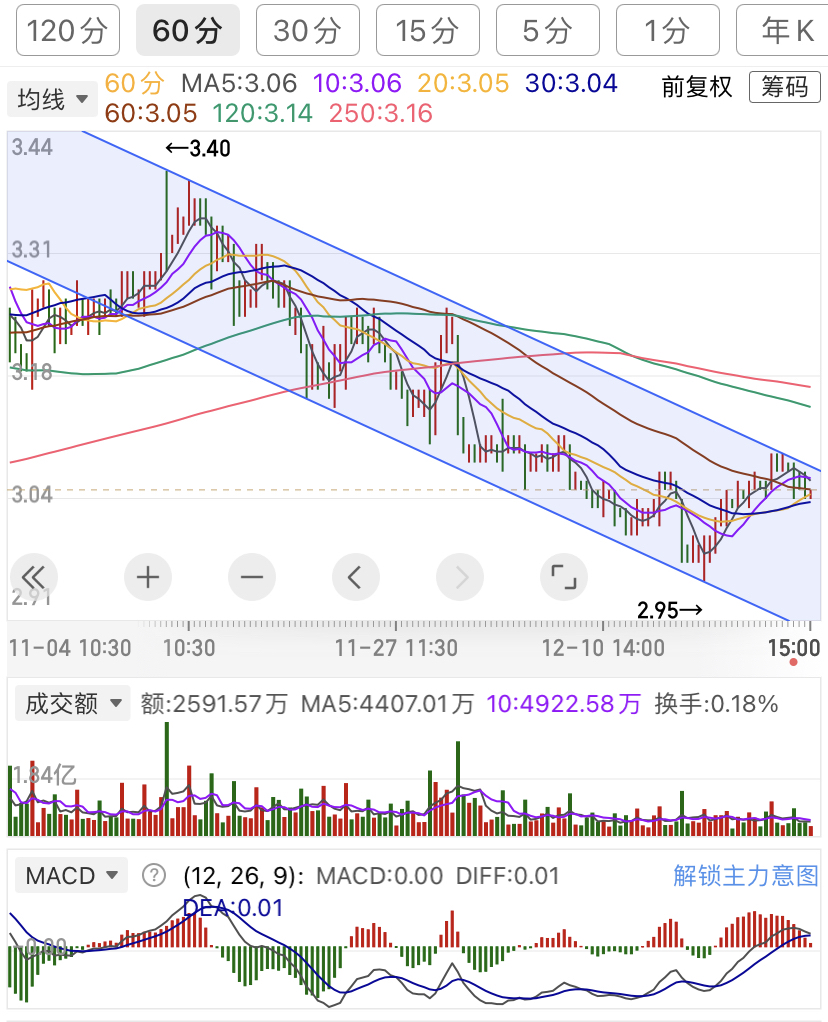 仍旧处于下降通道中,即将死叉,继续等待2.85的到来。