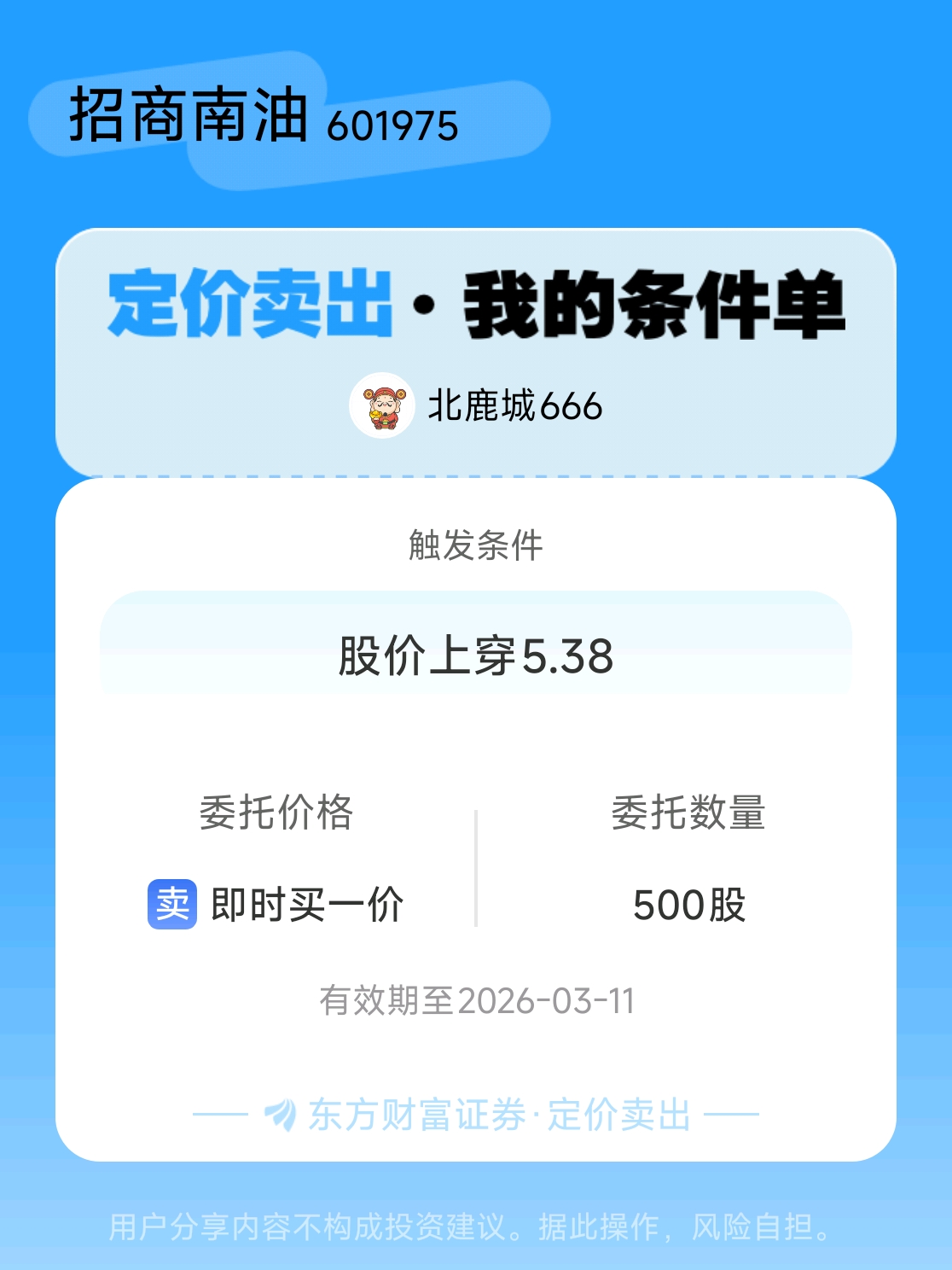 #条件单交流# #定价卖出晒单# 一位股神设置了一个定价卖出条件单,接下来就是见证奇迹的时刻~$招商南油(SH601975)$