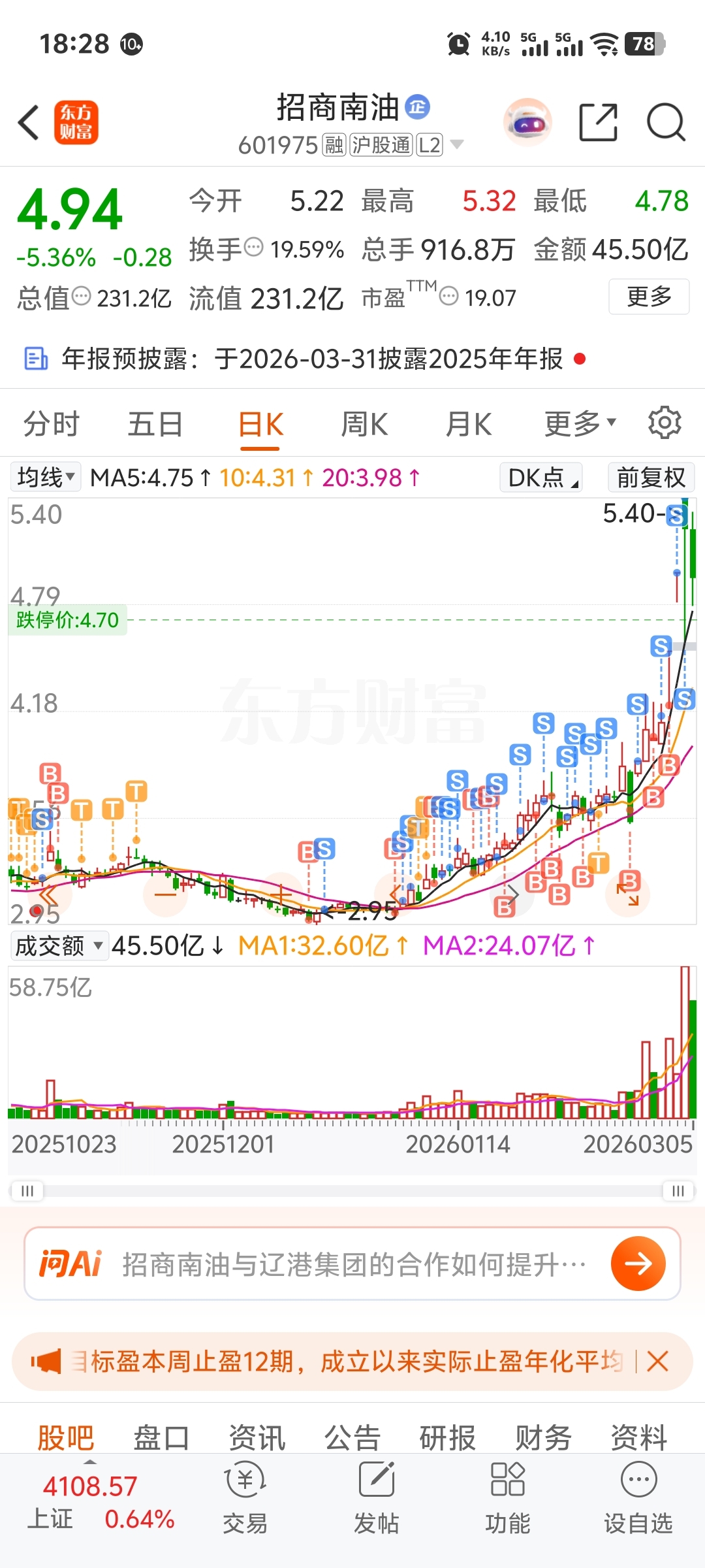 $招商南油(SH601975)$ 昨天开盘走的,进了三峡打个野,也算被动防守一下,今天观察南油一天,没敢进,可能是对这个股感情太深了,也太知道这个股的德性了,说套你行情在好都能套住你,长线的话没问题,短线现在分歧很大,我不敢进,如果一路长虹,我祝大家都挣钱,但是我可能个人很短视,我选择4.20左右等他吧,希望我是错的,谢谢大家!!!