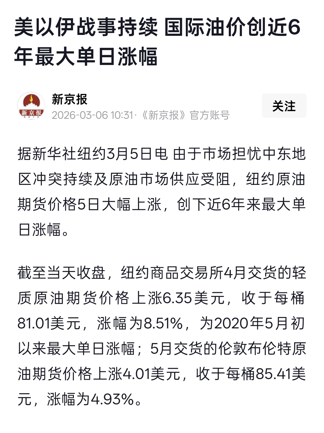 $招商南油(SH601975)$ 国际原油创6年来单日最大涨幅