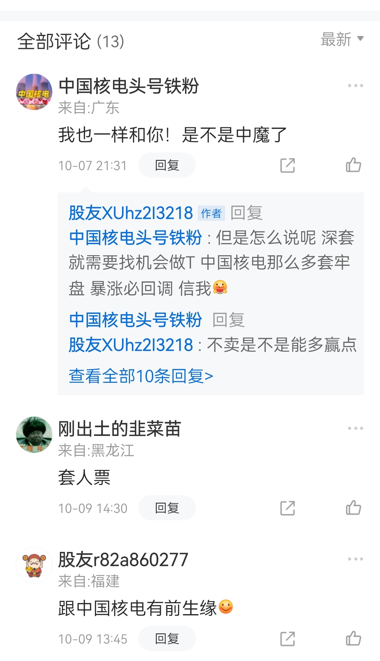 $中国核电(SH601985)$ 中国核电周一操作我估计开盘下跌,反弹继续下跌尾盘拉升 然后买入继续做T,降低成本,快看到曙光了,从分红到现在,还亏1.9%