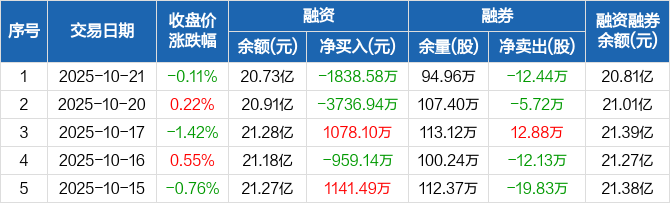 融资方面,当日融资买入8414.01万元,融资偿还1.03亿元,融资净偿还1838.58万元。融券方面,融券卖出4400股,融券偿还12.88万股,融券余量94.96万股,融券余额859.39万元。融资融券余额合计20.81亿元。