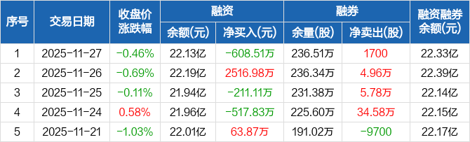 中国核电:融资净偿还608.51万元,融资余额22.13亿元(11-27)