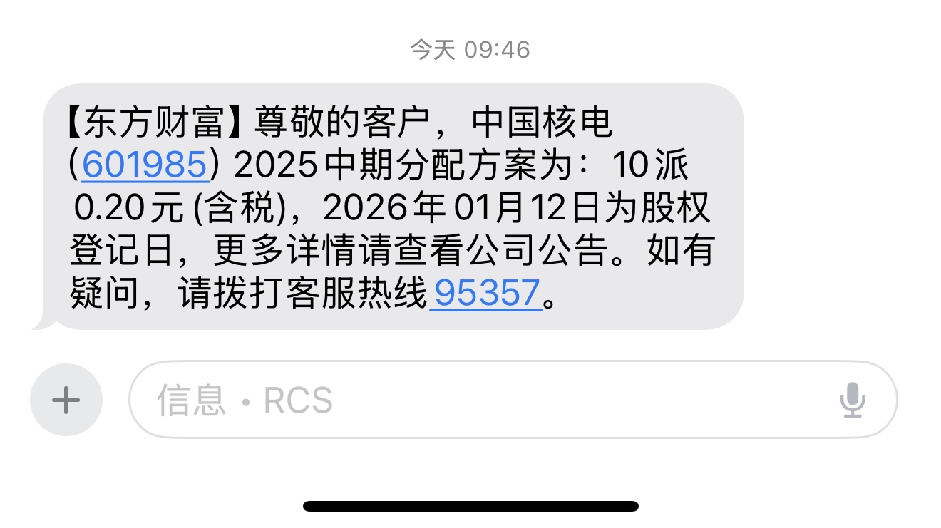 $中国核电(SH601985)$ 收到短信了,领钱喽,一股不卖,你快跌我再加点