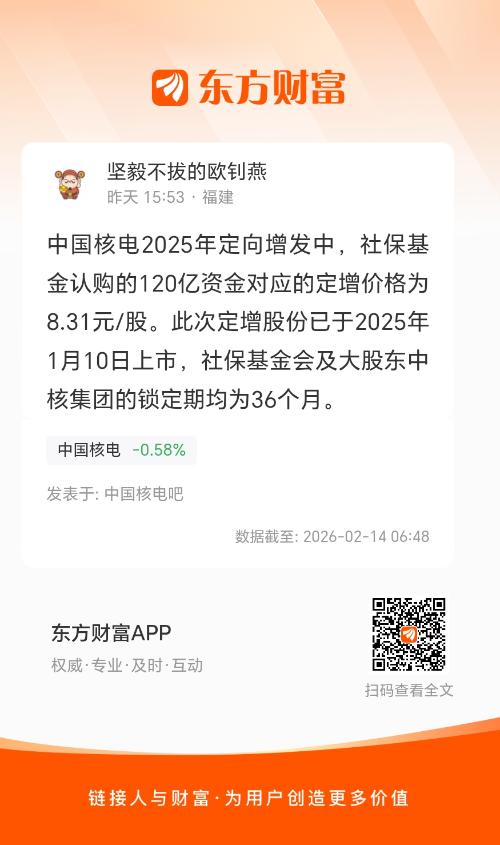 中国核电2025年定向增发中,社保基金认购的120亿资金对应的定增价格为 8.31元/股。此次定增股份已于2025年1月10日上市,社保基金会及大股东中核集团的锁定期均为36个月。