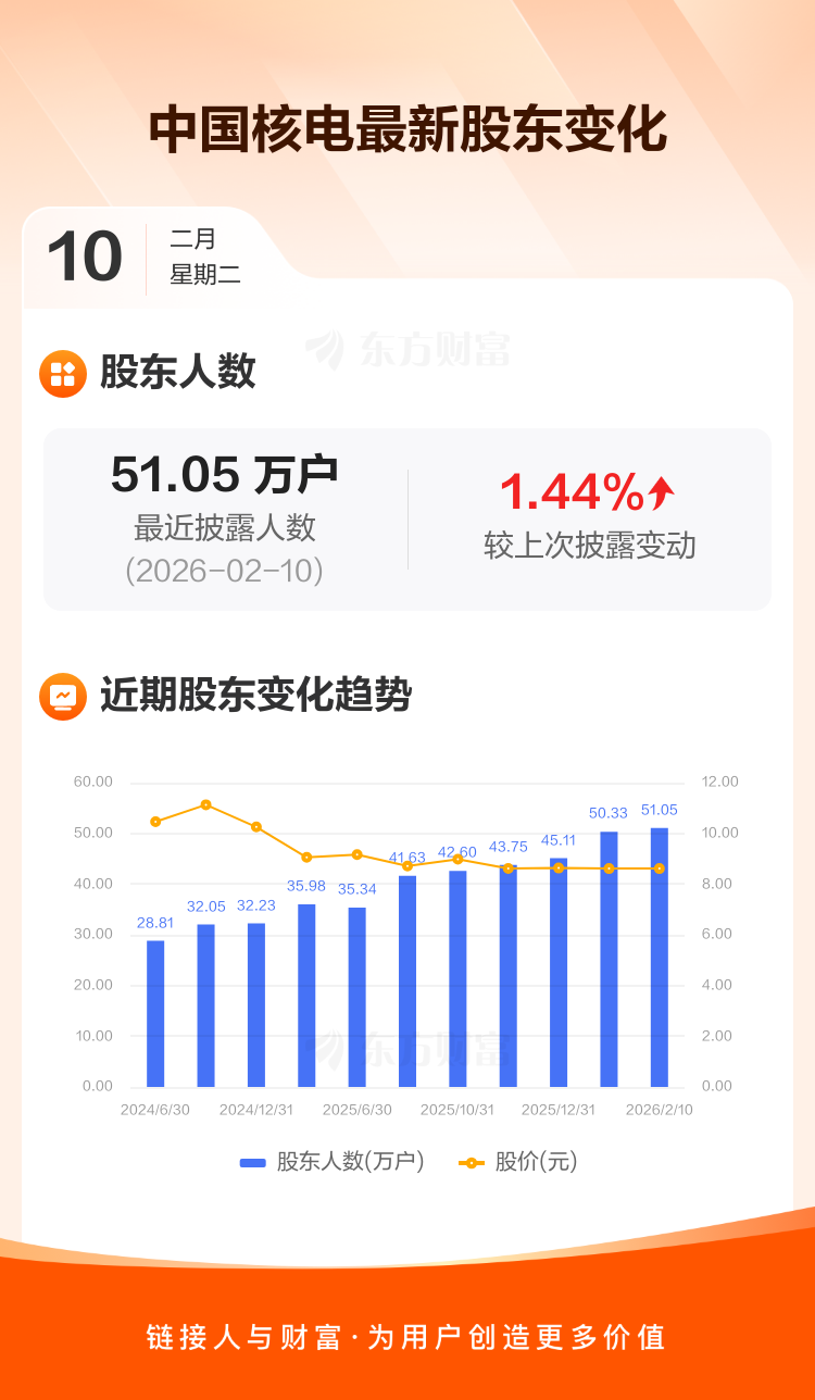 中国核电:截至2月10日最新股东户数51.05万户,较上期增加1.44%