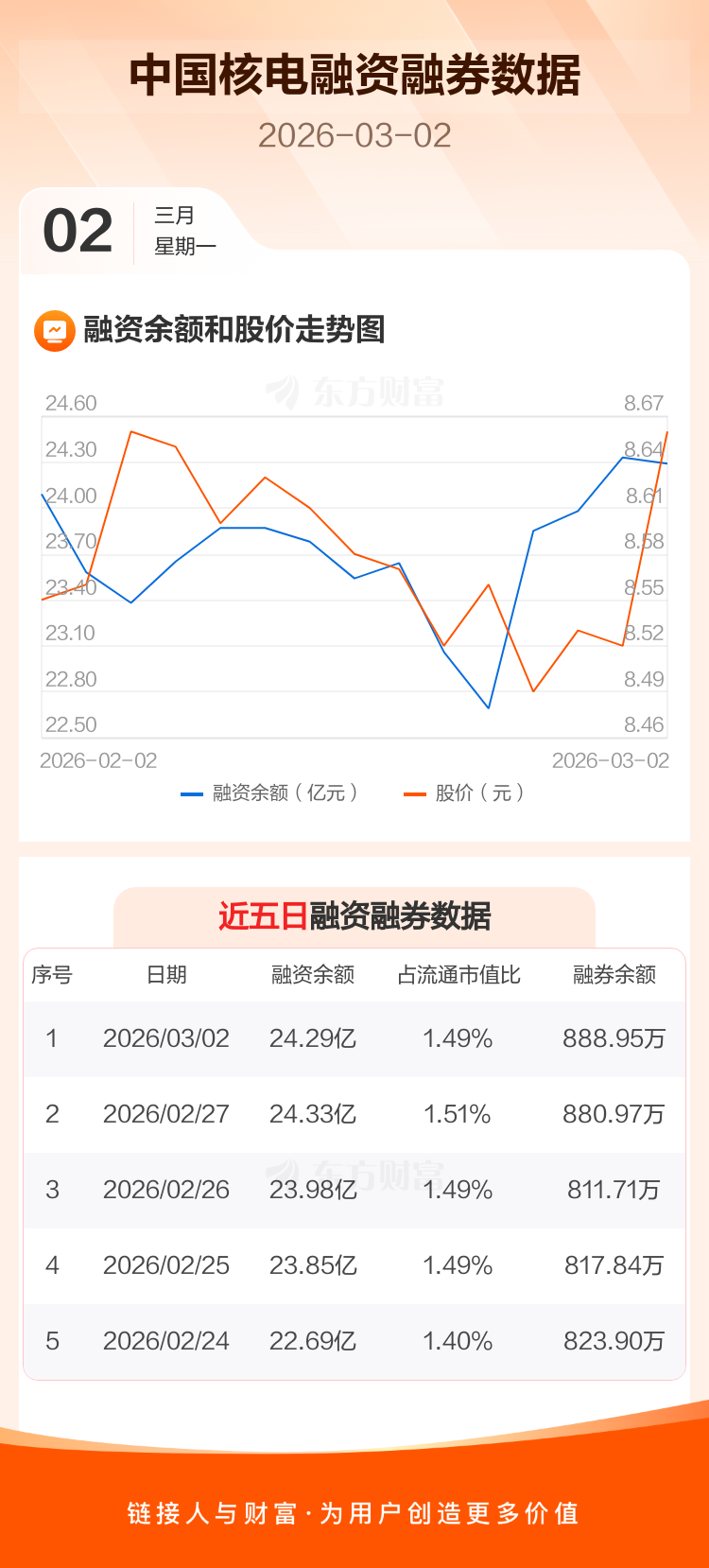 交易所最新数据显示,中国核电于2026年3月2日获融资买入2.05亿元,融资偿还2.10亿元,当日融资净偿还407.23万元。目前,该股融资余额24.29亿,占流通市值比例为1.49%。