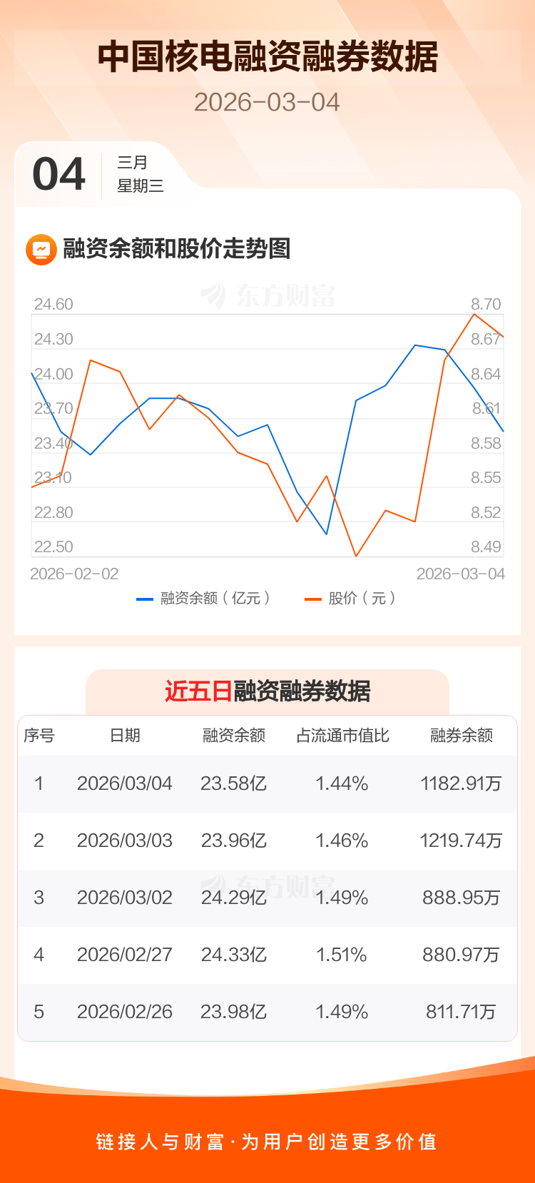 交易所最新数据显示,中国核电于2026年3月4日获融资买入9836.28万元,融资偿还1.36亿元,当日融资净偿还3801.5万元。目前,该股融资余额23.58亿,占流通市值比例为1.44%。