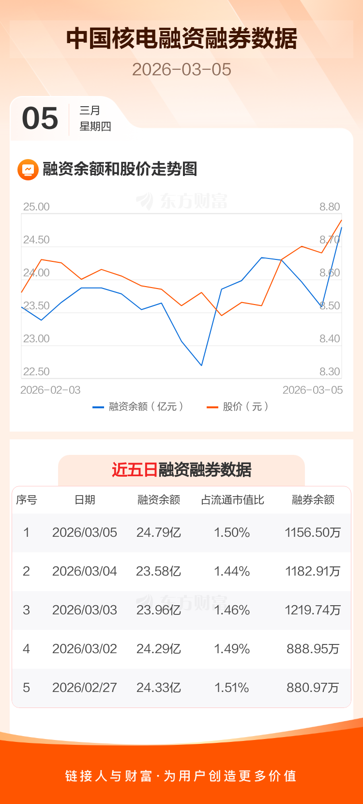 交易所最新数据显示,中国核电于2026年3月5日获融资买入2.92亿元,融资偿还1.71亿元,当日融资净买入1.22亿元。目前,该股融资余额24.79亿,占流通市值比例为1.50%。