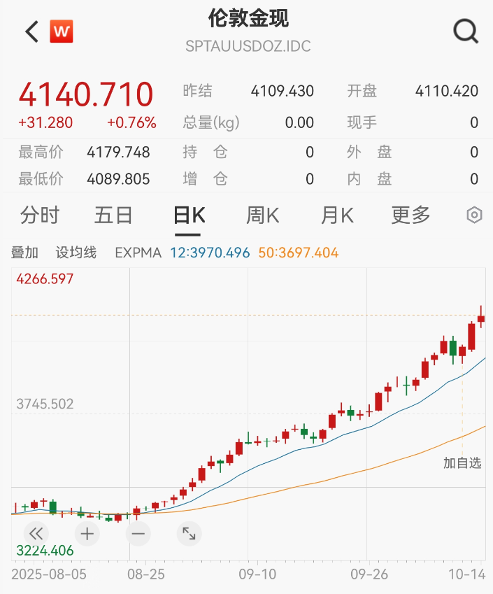 10月14日,现货黄金延续近期猛涨行情,盘中最高价一度逼近4180美元/盎司,创历史新高。