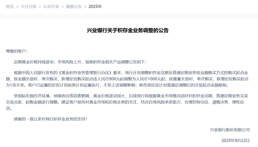 兴业银行则在9月22日发布公告称,调整积存金活期及普通定期业务按金额购买方式的购买起点金额:按金额交易时,单次购买、新增定投购买起点由900元起调整为1000元起。