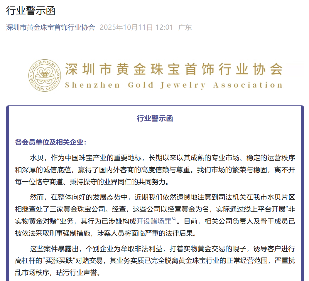 此外,投资者也应当注意,选择正规渠道投资黄金。10月11日,深圳市黄金珠宝首饰行业协会发布行业警示函,其中提到,司法机关在深圳水贝片区相继查处了三家黄金珠宝公司。经查,这些公司以经营黄金为名,实际通过线上平台开展“非实物黄金对赌”业务,其行为已涉嫌构成开设赌场罪。