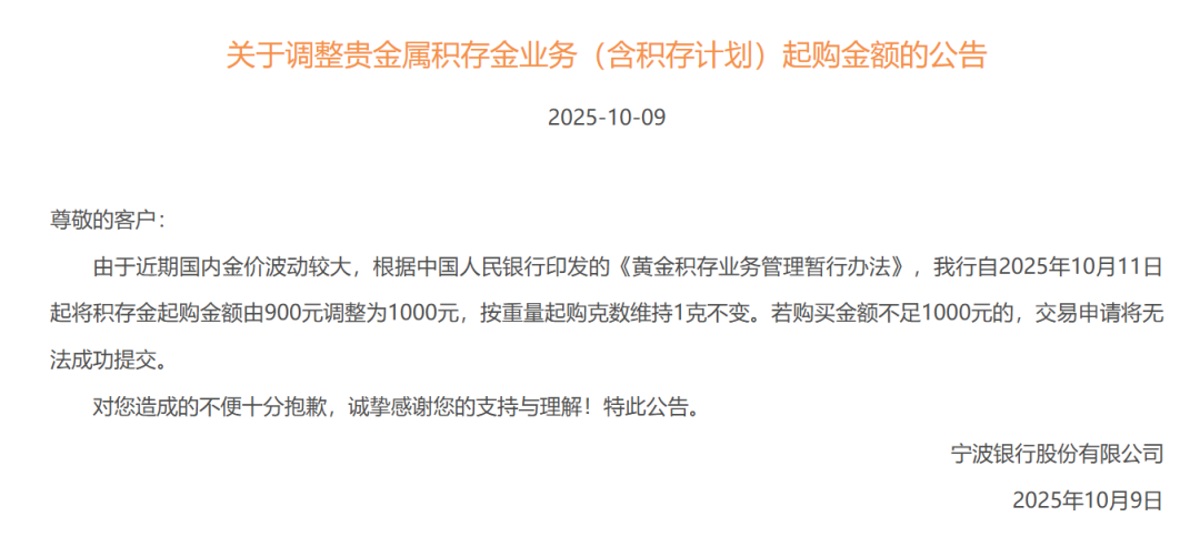 10月9日,宁波银行在官网发布关于调整贵金属积存金业务(含积存计划)起购金额的公告。该行自2025年10月11日起将积存金起购金额由900元调整为1000元,按重量起购克数维持1克不变。若购买金额不足1000元的,交易申请将无法成功提交。