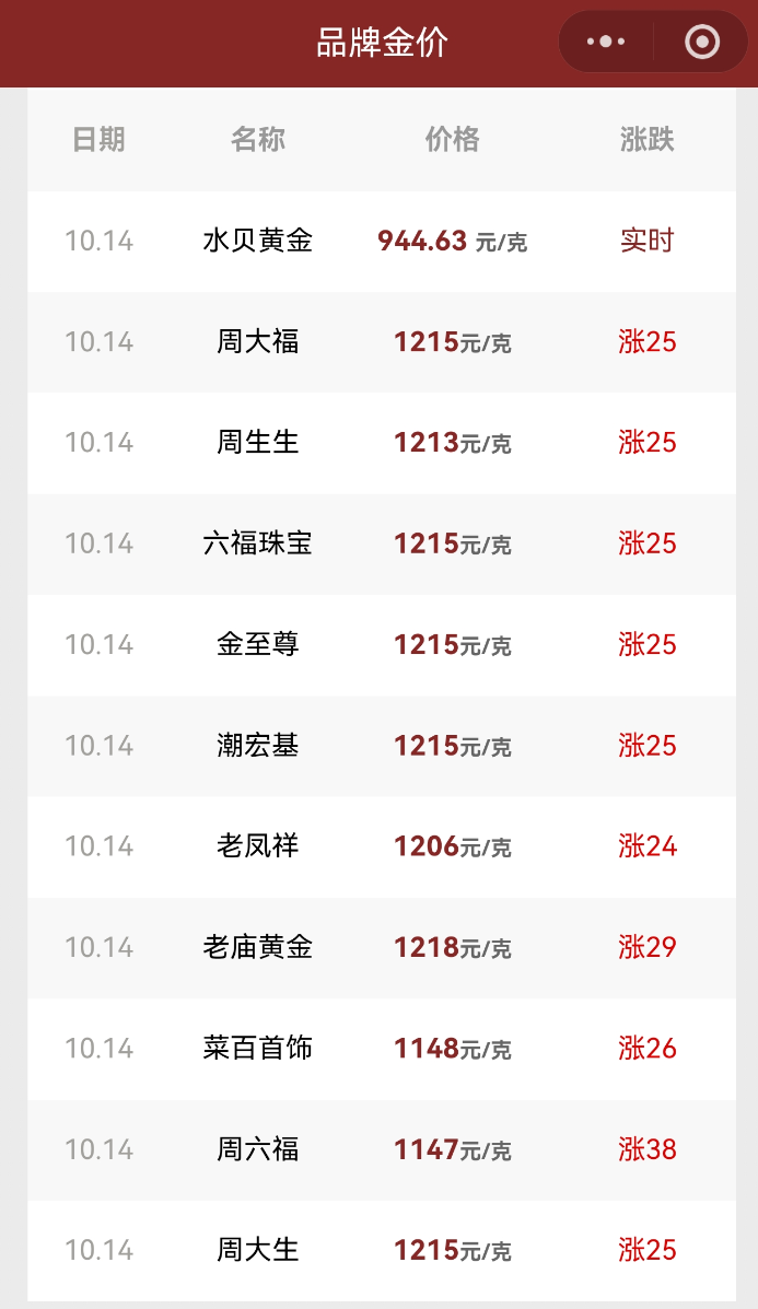 受金价飙升影响,国内珠宝品牌足金首饰价格也出现明显上涨。10月14日,老庙黄金足金饰品价格涨至1218元/克,周大福、六福珠宝、潮宏基、金至尊涨至1215元/克,周生生涨至1213元/克。