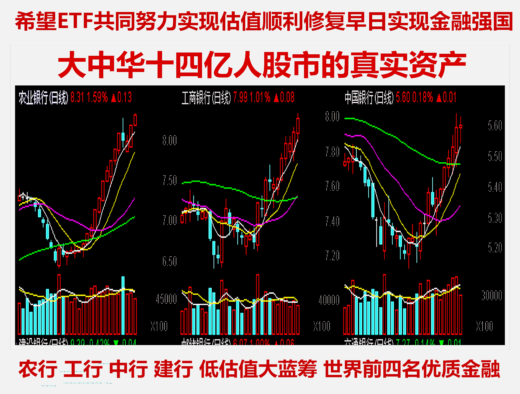 大中华十四亿人民股市的真实资产,希望ETF共同努力实现估值顺利修复早日实现金融强国。农行、工行、中行、建行,低估值大蓝筹,世界前四名优质金融银行!