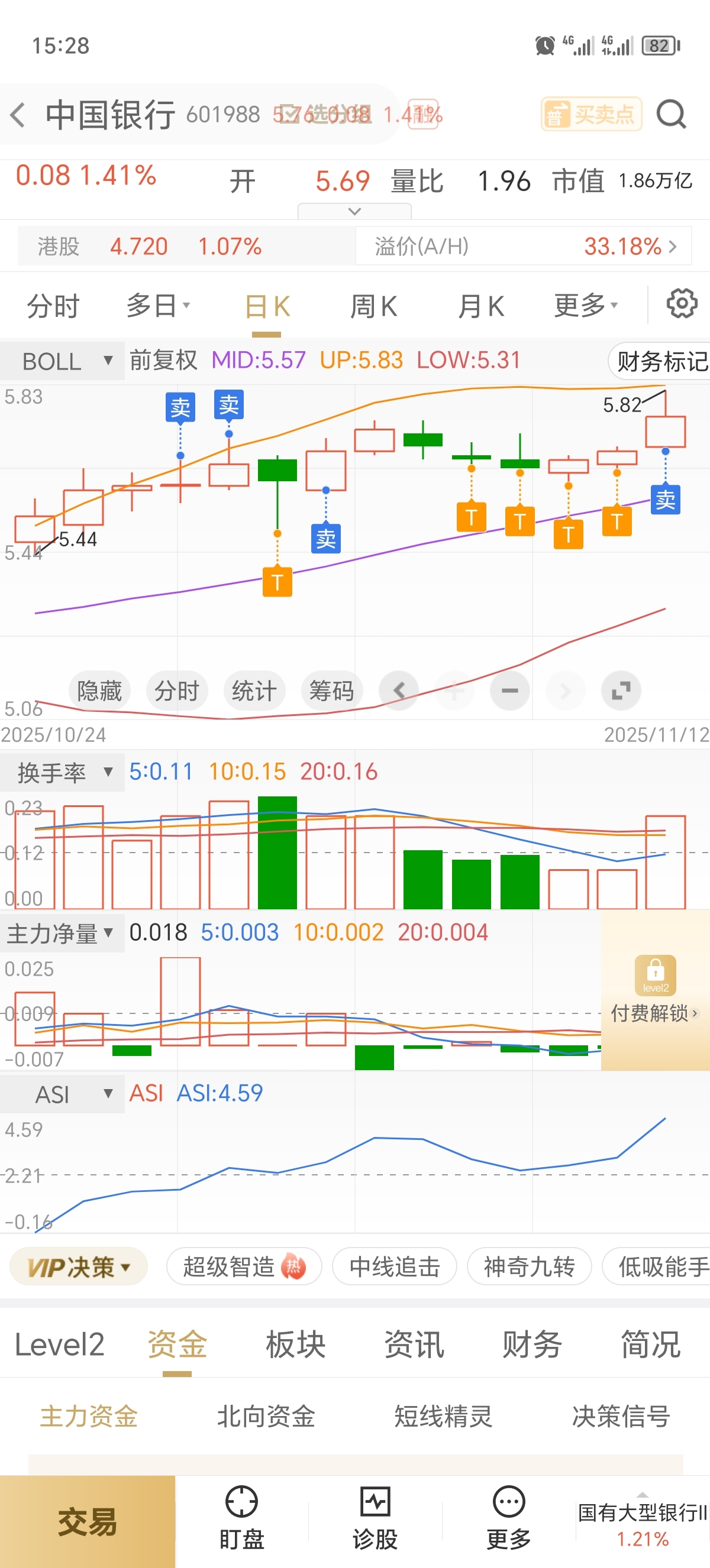 这一段时间中国银行的长势不错哦,挣了不少钱。还是要做一下T才得啊。