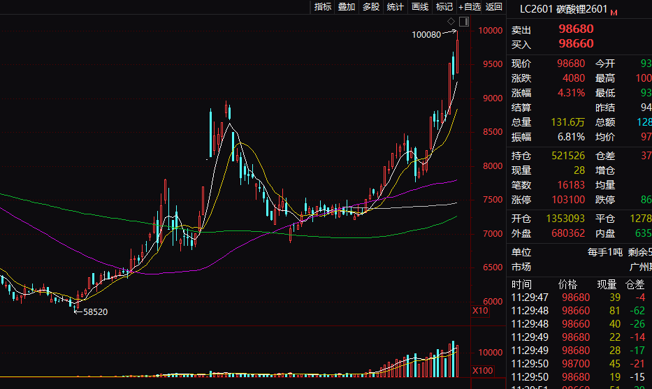 国内期货市场方面,碳酸锂期货今天上午大涨,主力合约盘中强势突破10万元/吨,为时隔一年多重新突破10万元/吨,盘中涨幅接近6%。